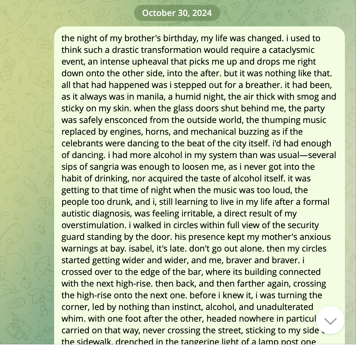 the night of my brother's birthday, my life was changed. i used to think such a drastic transformation would require a cataclysmic event, an intense upheaval that picks me up and drops me right down onto the other side, into the after. but it was nothing like that. all that had happened was i stepped out for a breather. it had been, as it always was in manila, a humid night, the air thick with smog and sticky on my skin. when the glass doors shut behind me, the party was safely ensconced from the outside world, the thumping music replaced by engines, horns, and mechanical buzzing as if the celebrants were dancing to the beat of the city itself. i'd had enough of dancing. i had more alcohol in my system than was usual—several sips of sangria was enough to loosen me, as i never got into the habit of drinking, nor acquired the taste of alcohol itself. it was getting to that time of night when the music was too loud, the people too drunk, and i, still learning to live in my life after a formal autistic diagnosis, was feeling irritable, a direct result of my overstimulation. i walked in circles within full view of the security guard standing by the door. his presence kept my mother's anxious warnings at bay. isabel, it's late. don't go out alone. then my circles started getting wider and wider, and me, braver and braver. i crossed over to the edge of the bar, where its building connected with the next high-rise. then back, and then farther again, crossing the high-rise onto the next one. before i knew it, i was turning the corner, led by nothing than instinct, alcohol, and unadulterated whim. with one foot after the other, headed nowhere in particular, i carried on that way, never crossing the street, sticking to my side of the sidewalk, drenched in the tangerine light of a lamp post one second and then back into the darkness next. a few joggers passed by me, and then maids walking their owners' dogs. i love the city at night. i love the contrast of illuminated lobbies through glass doors against the dark. i wonder, for a good minute, the kind of person i'd be if i lived in this building or that.